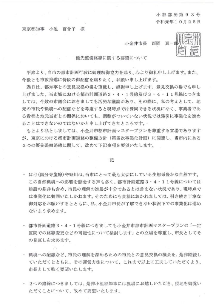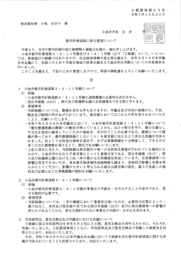 小金井市議会はこれまで都市計画道路に関する12件の意見書・決議を可決し、都にも提出していますが、市長からの要望書は、2019年10月に西岡前市長が都に提出したものが直近の文書でした。その内容は、3・4・11号線について市民の理解が進んでいないとし、「現時点では事業化に賛同いたしかねる」とし、市長が了解できない状況下での事業化を進めないよう求めるものです。