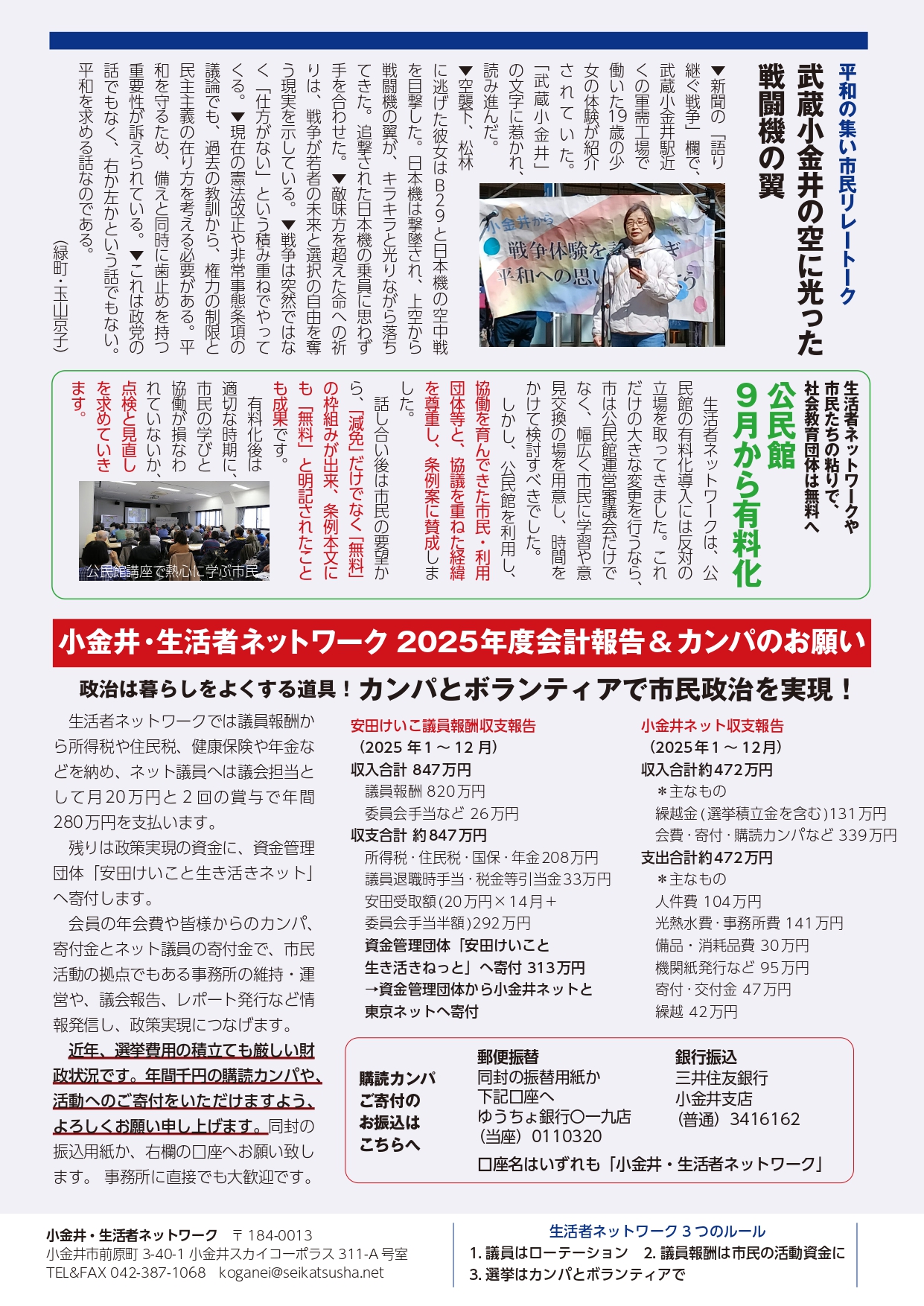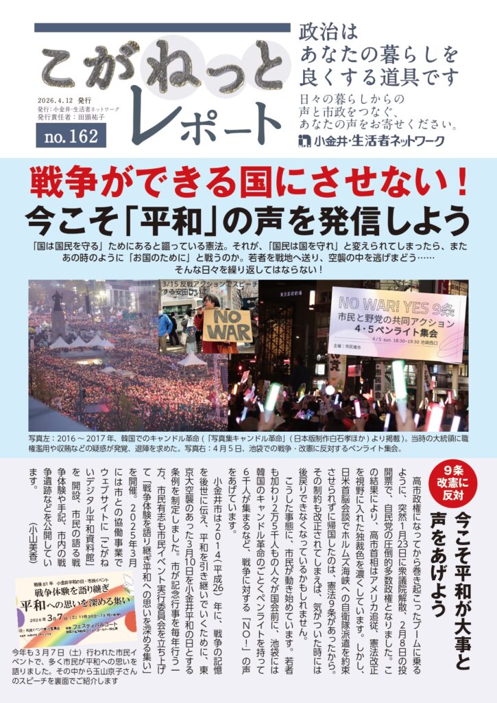 2026年4月20日 / 最終更新日 : 2026年4月20日 yasuda 小金井ネットレポート 今こそ平和の声を!! こがねっとレポートno.162 発行 皆様のカンパとボランティアで活動しています。 購読カンパ、ご寄付をいただけると幸いです。 郵便振替 ゆうちょ銀行〇一九店 当座 0110320 口座名:小金井・生活者ネットワーク 銀行振込 三井住友銀行 小金井支店 普通 3416162 口座名:小金井・生活者ネットワーク FacebookXBlueskyHatenaCopy