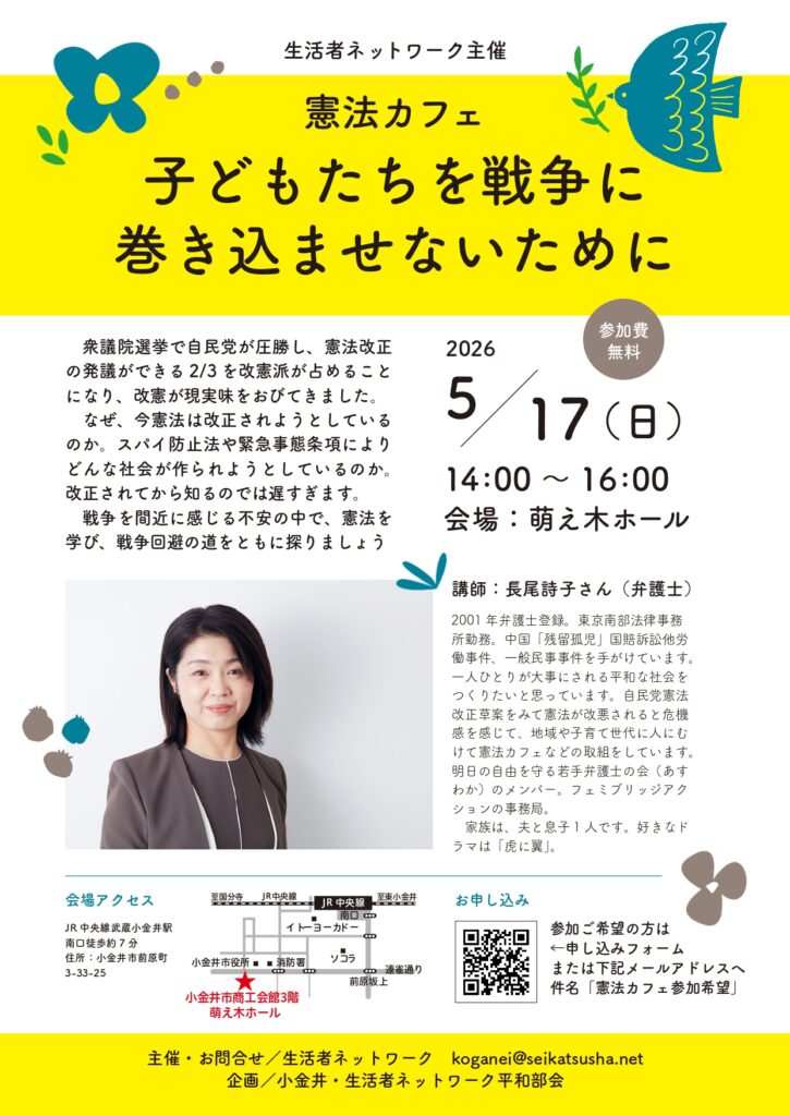 2026年4月20日 / 最終更新日 : 2026年4月20日 yasuda 憲法カフェ「子どもたちを戦争に巻き込ませないために」開催のお知らせ 生活者ネットワーク主催で憲法カフェを開催します。 講師は、弁護士で明日の自由を守る若手弁護士の会(あすわか)メンバーの長尾詩子さんです。 この機会にわからないこと、なんでも聞いちゃいましょう! ぜひご参加ください FacebookXBlueskyHatenaCopy
